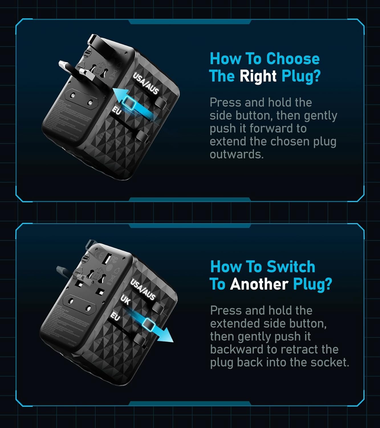 The Travel Mate universal travel adapter is a must-have for any global traveler. With its smart design that allows switching between US, AU, EU, and UK plugs with just a button push, it ensures you stay connected without the hassle of carrying extra adapters. Powered by a universal socket capable of 2500W, Travel Mate can charge anything from hair dryers to laptops. Whether you’re plugging in across North America or Europe, its powerful yet compact design means your devices will never miss a beat. Light enough to pack in any bag but strong enough to handle high-wattage appliances, Travel Mate gives the mobile professional or jet-setting vacationer the freedom to work and play anywhere in the world.