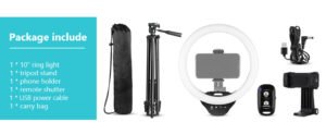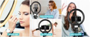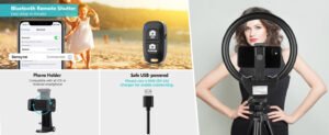 - Versatile Accessories: The USB-powered control helps protect your safety while improving the ring light’s brightness. The phone holder is spring-loaded and extends up to 5.3″” wide, it is compatible with almost ALL smartphones with or without a case.